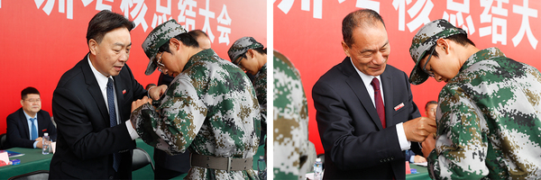 党委书记张志坚代表学校向承训部队赠送锦旗,感谢部队官兵对我校新生军训工作的辛勤付出。校领导为2025级新生代表佩戴了校徽。